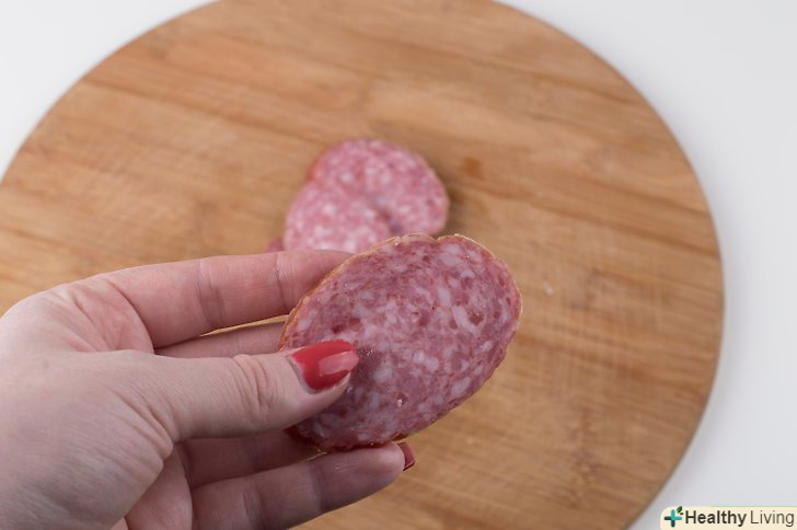 Додайте шматочки шинки.покладіть шматочки шинки поверх маринованих огірків. Якщо шматочки тонкі і великі, то складіть їх. Можна використовувати будь-який вид шинки, яка вам більше подобається або яка у вас є в даний момент.[5]- При бажанні ви можете використовувати навітьзапечену шинку з домашньою медовою глазур'ю.