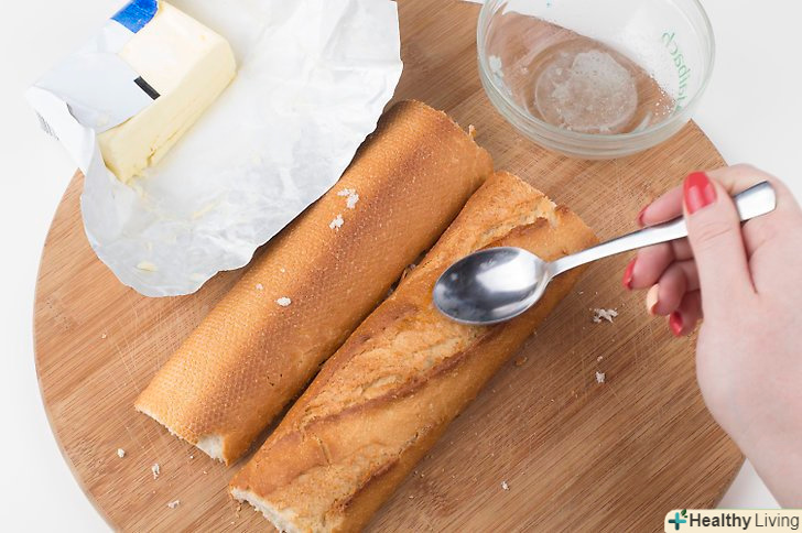 Змастіть батон зовні вершковим маслом.завдяки цьому він не прилипне до тостера. Це буде простіше зробити до додавання всіх інгредієнтів.- Якщо у вас є кулінарний спрей, то можете пропустити цей крок і змастити сендвіч безпосередньо перед тим, як покласти його в тостер.