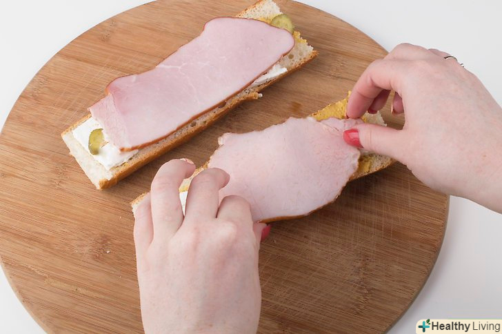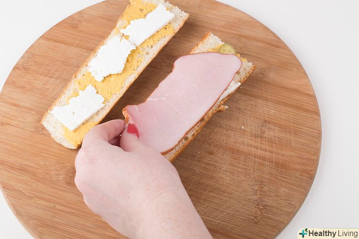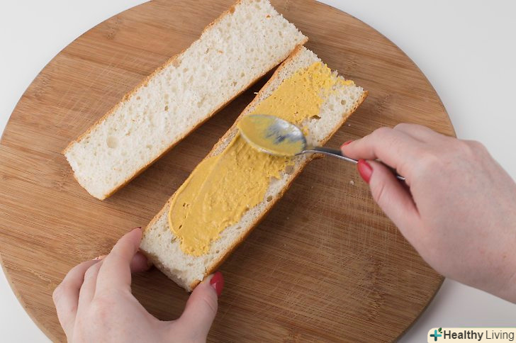 Намажте на батон гірчицю.намажте приблизно 2 столові ложки (40 г) гірчиці на обидві сторони батона з того боку, з якої Ви його розрізали.[2]- Майже у всіх рецептах сендвічів використовується гірчиця, але якщо ви не любите гірчицю або використовуєте занадто пряну шинку, то можете подати гірчицю окремо.[3]