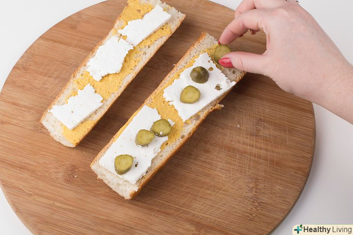 Покладіть скибочки маринованих огірків.розріжте два великих маринованих огірки на 8-10 тонких шматочків (або ж ви можете придбати вже нарізані мариновані огірки). Покладіть їх з одного боку сендвіча.