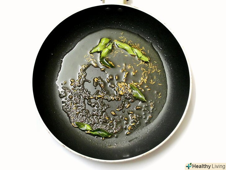 Всипте трохи насіння кмину, насіння гірчиці і листя каррі.
