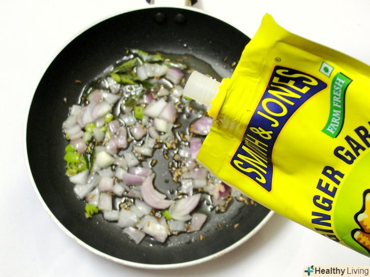 Коли кмин почне темніти, додайте цибулю, зелений перець чилі і кілька ложок імбирно-часникової пасти і добре обсмажте.