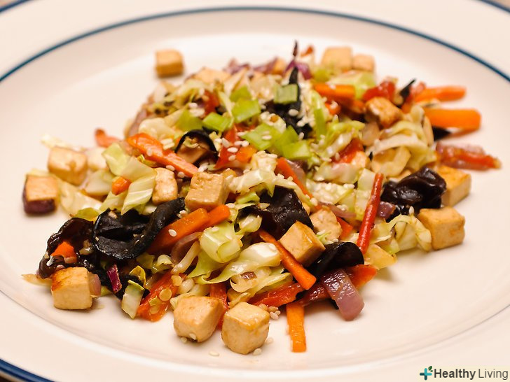 Приготуйте білкові продукти.обсмажені овочі смачні самі по собі, але білок необхідний організму, тому додайте тофу, куряче м'ясо, яловичину, свинину або інше м'ясо. Щоб додати білкові продукти:- Поріжте м'ясо на маленькі тонкі шматочки»на один укус". Товсті шматки не приготуються швидко. А Ваше завдання приготувати все рівномірно.