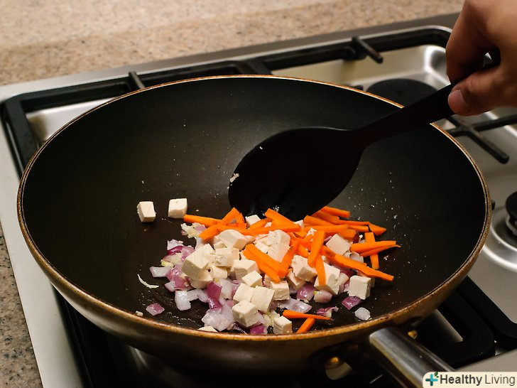Додайте і перемішайте інгредієнти, які готуються довше.крім тофу і м'яса, покладіть в сковороду щільні і жорсткі овочі, такі як картопля, морква, брокколі, цвітну капусту, гарбуз і квасолю. Швидко перемішуйте їх дерев'яною ложкою або струшуйте.- Щоб овочі не були розм'яклими або недожареннимі, кладіть таку кількість овочів, щоб покрити дно сковороди, не більше. Так як ви смажите овочі швидко, можете готувати їх частинами, дозволяючи сковороді і маслу добре прогрітися перед новою партією овочів.