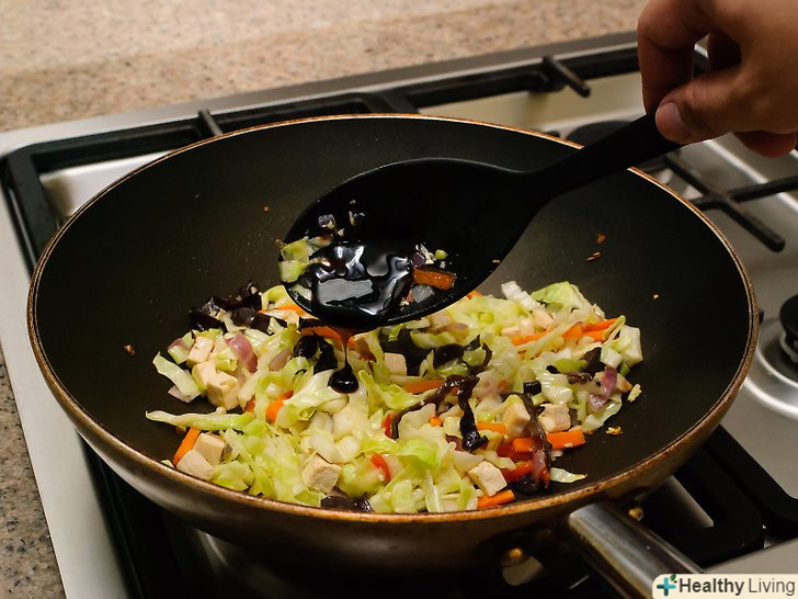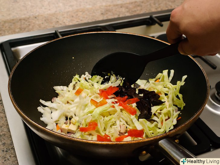Додайте овочі, які готуються швидко.оскільки жорсткі інгредієнти майже готові, додайте інгредієнти, які приготуються швидко. Продовжуйте активно перемішувати інгредієнти на сковороді, додаючи залишилися продукти.- До таких овочів відносяться Пекінська капуста, болгарський перець, гриби.