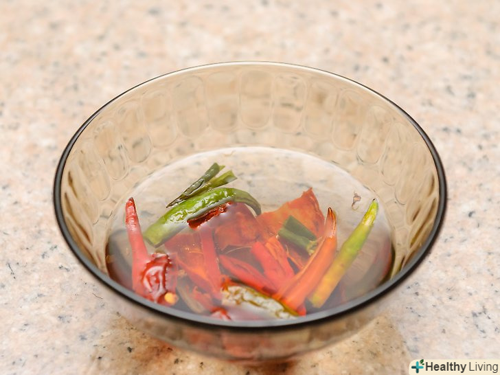 Пом'якшіть перець.помістіть Чилі в миску середніх розмірів і залийте окропом. Накрийте миску чистим рушником і замочуйте Чилі 20 хвилин, поки він не розм'якне.- Через 20 хвилин дістаньте Чилі з миски, але не виливайте воду.[8]