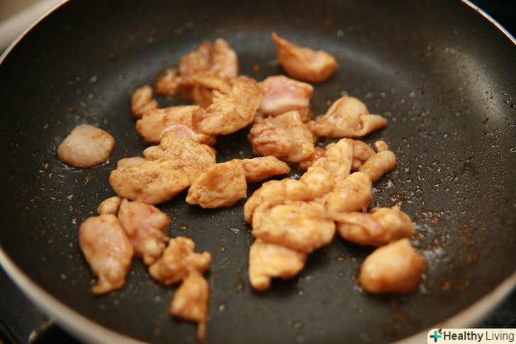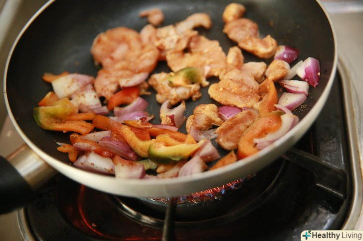 У великому сотейнику розігрійте масло на середньому вогні.змішайте зелений перець, червоний перець, цибулю і курку. Готуйте овочі приблизно десять хвилин, до того, як курка більше не буде рожевою всередині.