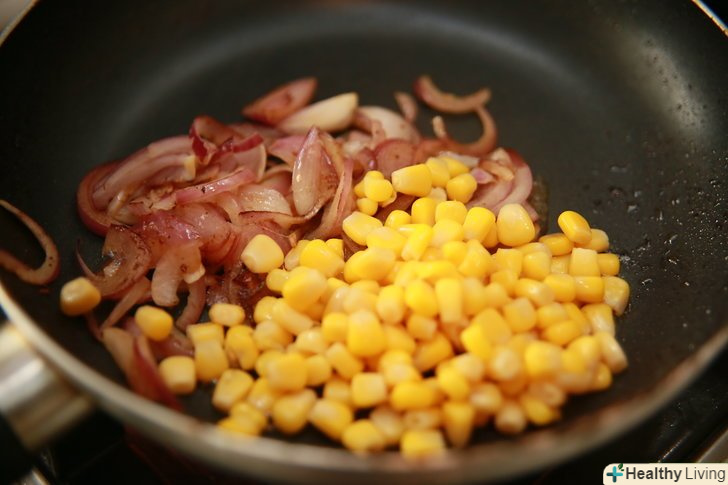Додайте кукурудзу до цибулі.готуйте до злегка рум'яного стану кукурудзи і цибулі. Видаліть з сковороди і відставте.