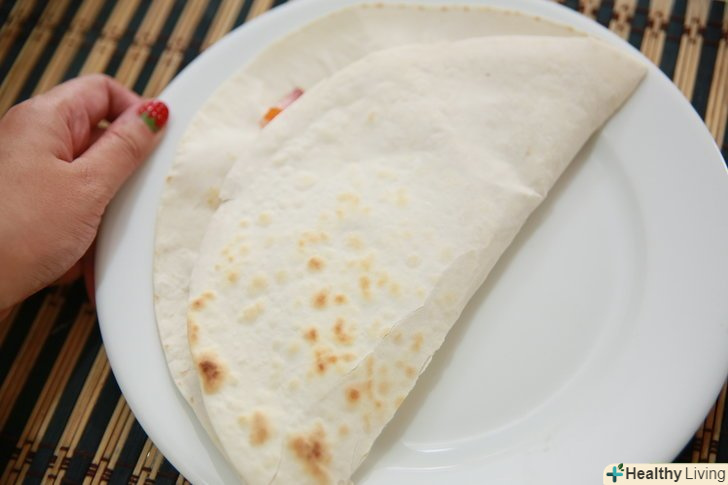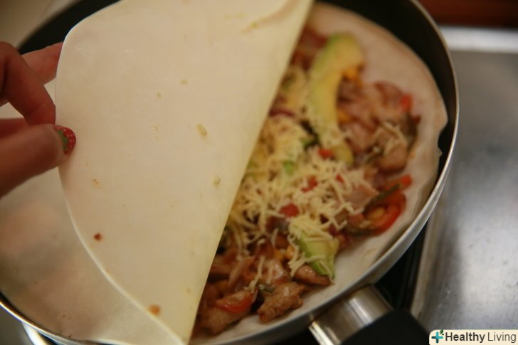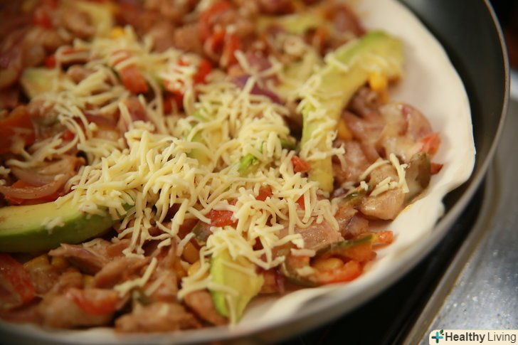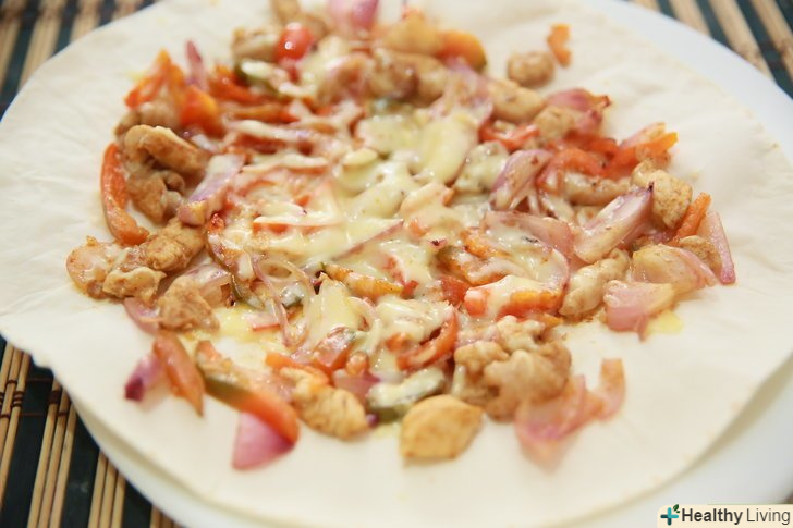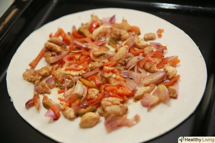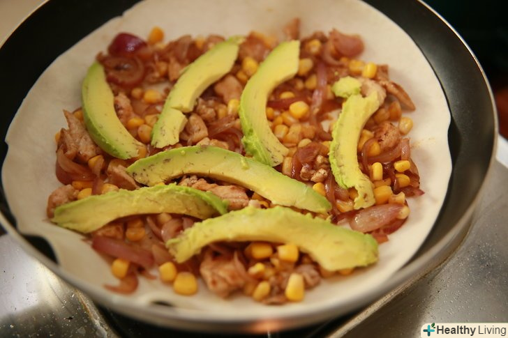 Додайте цибулю, кукурудзу, боби, курку і авокадо.переконайтеся, що всі інгредієнти добре розподілені на тортильї.