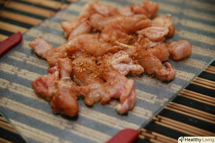 Змішайте курку з приправою Фахіта.викладіть курку на змащене спреєм деко. Помістіть в духовку приблизно на 5 хвилин. Як тільки курка трохи підрум'яниться, вийміть з духовки і наріжте на шматочки поменше. На цьому етапі курка все ще може бути не готова.