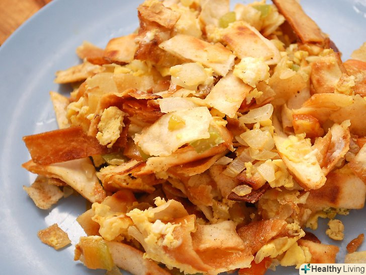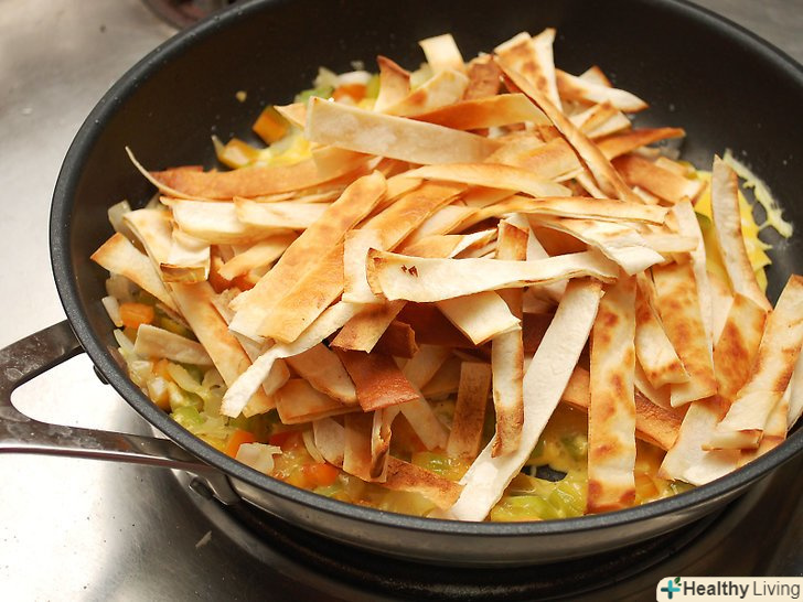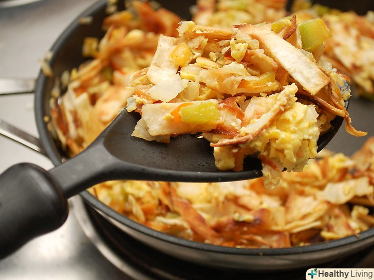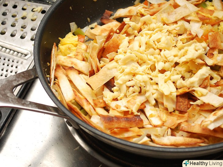 Викладіть смужки тортильї в сковороду.рівномірно викладіть їх на непрожаренное яйце. Притисніть смужки лопаткою так, щоб вони зникли по яєчної сумішшю.- Якщо ви хочете, щоб смужки тортилій залишалися хрусткими, не занурюйте їх в яєчну суміш повністю. Залиште їх на поверхні, тоді краю не розмокнуть.
