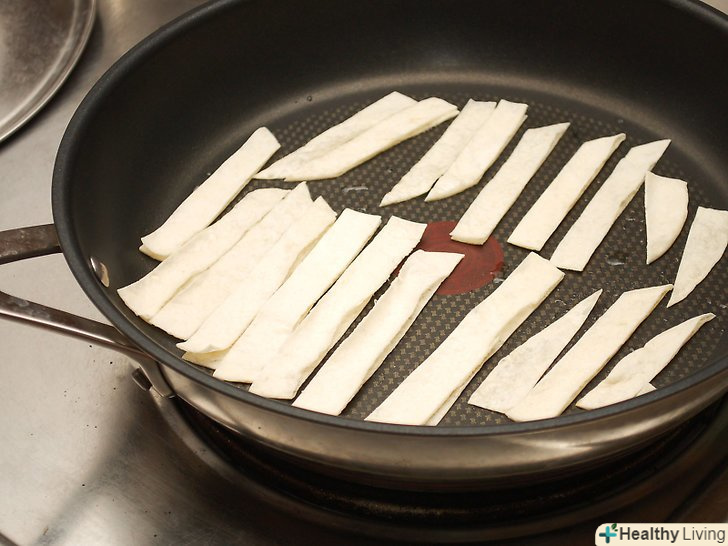 Підсмажте смужки тортилій.покладіть смужки в масла і обсмажуйте з кожного боку протягом приблизно 20 секунд. Переверніть щипцями і обсмажте з іншого боку; смужки повинні стати коричневими і хрусткими. Викладіть на серветку і дайте обсохнути.- Деякі пропускають цей крок, вважаючи за краще їсти Мігас зі свіжими, а не хрусткими тортильями. Якщо такий варіант вам подобається більше, просто поріжте тортильї на смужки і переходите до наступного розділу.
