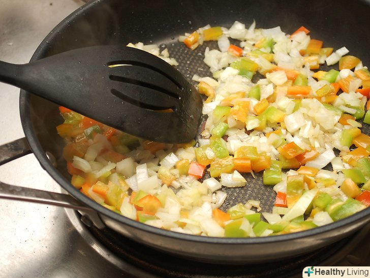 Приготуйте овочі.розігрійте в сковороді ще масла, знову ж таки на середньому вогні. Коли масло стане гарячим, викладіть в сковороду порізану цибулю і перець. Нехай овочі смажаться кілька хвилин, потім перемішайте лопаткою. Продовжуйте підсмажувати овочі до тих пір, поки цибуля не стане напівпрозорим, а перець - трохи м'яким.