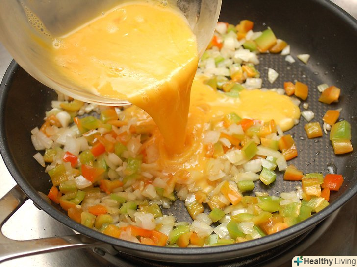 - Якщо ви додаєте порізаний сир, половину можна додати в яєчну суміш до того, як виливати її в сковорідку, а другу, коли яйця будуть вже майже готові.