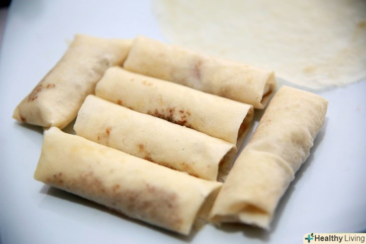 Загорніть турон.почніть складати верх і низ листа до середини. Обережно поверніть лист на 180 градусів, так, щоб розгорнута сторона була звернена до вас. Скрутіть лист від вас, також як для яєчного або желейного ролу. Нанесіть пензлем великий яєчний білок на край листа, щоб запечатати його. Закінчите начиняти і скручувати інші листи.- Після того, як турон буде обгорнутий, потрібно буде виконати ще один традиційний метод – закатати турон в коричневий цукор. Цукор буде карамелізуватися під час смаження турона. Або ж ви можете зробити сироп з коричневого цукру і піддати його після того, як турон посмажиться.[2]
