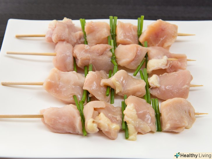 Намочіть дерев'яні шампури протягом 30 хвилин.опустіть їх у холодну воду приблизно на 10-15 см, щоб вони потім не загорілися. Бамбукові шампури, які називаютьсяТеппо гуші зазвичай ідеально підходять для приготування якіторі. Вони плоскі з одного боку, що дозволяє перевертати м'ясо на вогні. [6] однак, ви можете використовувати бамбукові або будь-які інші дерев'яні шампури.