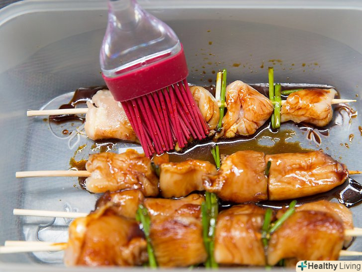 Якщо ви використовуєте гриль, то включіть його заздалегідь.якіторі традиційно готують на мангалі. Розпаліть вогонь в мангалі за 30-45 хвилин, щоб вогонь згас, і залишилися тліючі вуглинки. Можете також використовувати газовий гриль, який потрібно підігріти за 15-20 хвилин до користування. [4] якщо ви плануєте маринувати м'ясо, то зробіть це до того, як розпалювати вогонь в мангалі.- Японські кухарі вважають за краще використовувати деревне вугілля, яке тліє довго і менше пахне.[5]