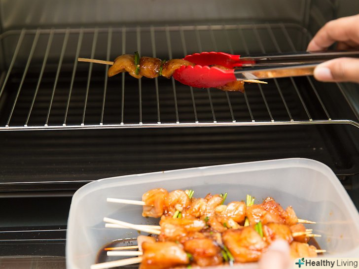 Посмажте якіторі в духовці.вони звичайно не матимуть того ж аромату, що і, приготовані на мангалі, проте за смаком не будуть нічим відрізнятися. Змастіть решітку маслом, щоб запобігти прилипання і застеліть деко фольгою, щоб зібрати надлишки жиру. Покладіть якіторі на решітку і помістіть її на самий верх духовки. Запікайте протягом 6 хвилин. Потім змастіть м'ясо соусом і знову помістіть в духовку на 3-4 хвилини, поки соус не карамелізується.[14]