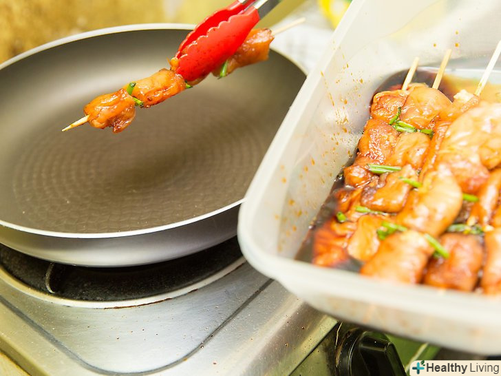 В якості альтернативи, використовуйте сковороду.якіторі не повинні бути жирними, тому покладіть в сковороду зовсім невелика кількість масла. Коли масло зашипить, покладіть м'ясо на сковороду і смажте на середньому вогні близько 5 хвилин з обох сторін.[15]