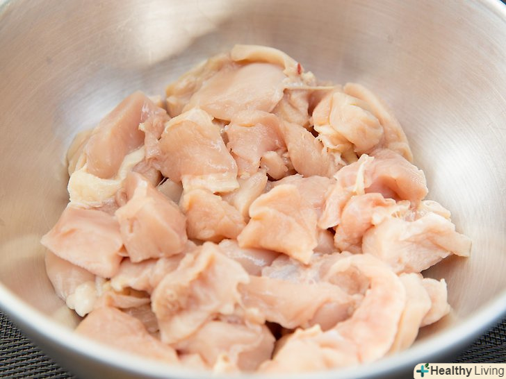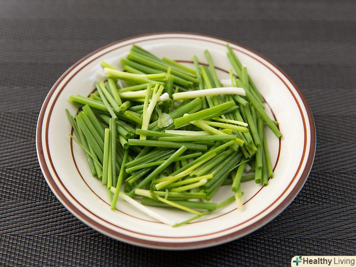 Відріжте коричневий кінець цибулі-шалот і викиньте.іншу частину наріжте так, щоб вийшли шматочки шириною в 2 см.[7] як варіант можна також дрібно нашаткувати коричневу частину, а потім посипати нею готову страву.- Спочатку наріжте цибулю, потім тим же ножем наріжте курятину. Якщо ви почала нарізали м'ясо, то промийте дошку і ніж і тільки потім приступайте до нарізки цибулі, щоб зменшити ризик зараження від сирого м'яса.