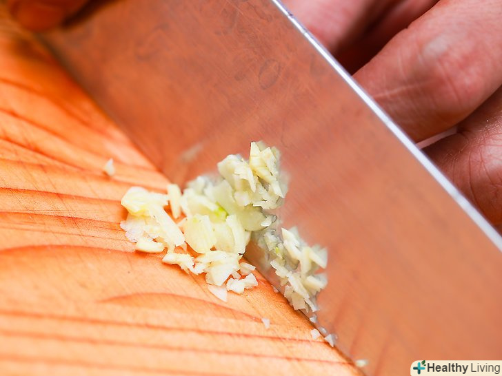 - Роздушіть зубчик часнику: для цього просто покладіть його на дошку і натисніть зверху, використовуючи бічну поверхню ножа. Потім очистіть часник і, якщо хочете, дрібно наріжте або пропустіть через прес для часнику.