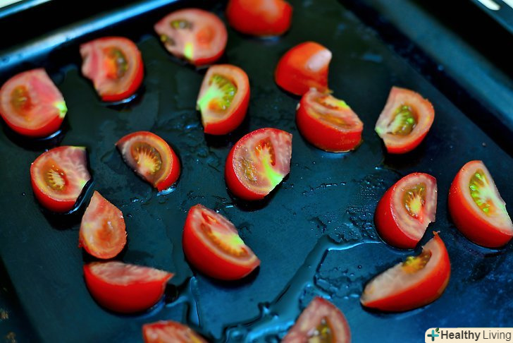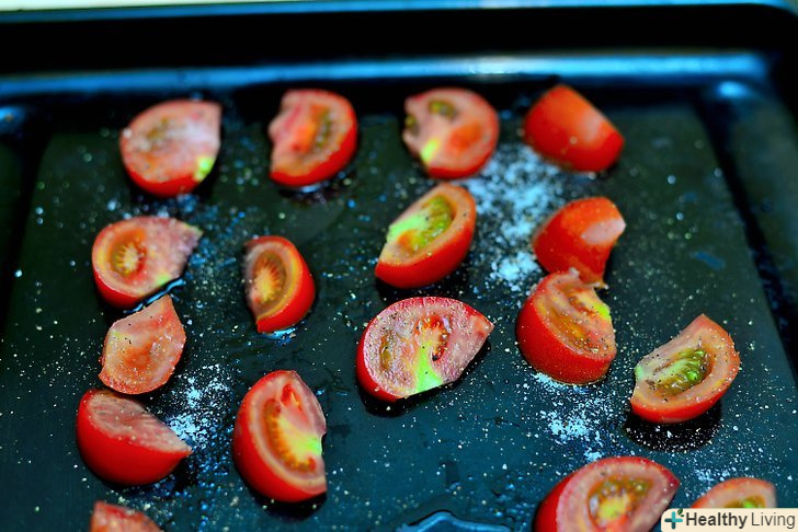 Помістіть половинки помідорів на деко, і полийте зверху 2 столовими ложками оливкової олії.