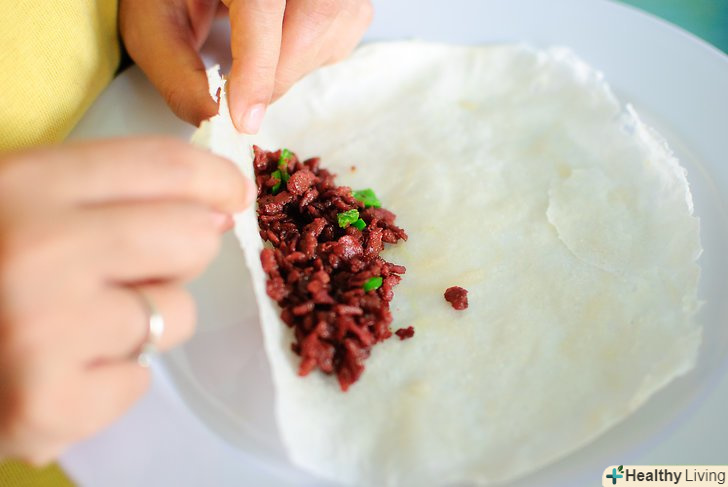 Візьміть один лист тіста і помістіть його на обробну дошку (або на тверду поверхню).покладіть на лист тіста з одного боку по діагоналі 3 столові ложки готової суміші. Залиште, принаймні, по одному сантиметру з обох сторін листа тіста. Візьміться за ту сторону тесту, яка знаходиться найближче до начинки, і загорніть її. Продовжуйте згортати. Коли ви дійдете до середини, подверніте краю з обох сторін. Продовжуйте згортати. Слідкуйте за тим, щоб начинка залишалася всередині. Коли ви дійдете до кінця, використовуйте трохи води, щоб закріпити край. Використовуйте харчову плівку для обгортання кожного ролу. Оберніть рол харчовою плівкою, поки ви готуєте наступний. Завдяки цьому роли не будуть сухими. Повторіть процес для кожного ролу.