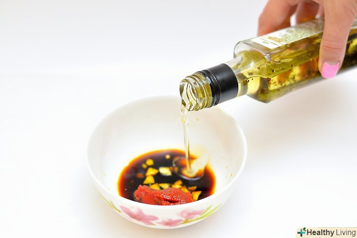 Пересипте інгредієнти в миску для змішування.Помістіть всі продукти для гострого корейського соусу в миску для змішування або невелику салатницю. Вам знадобляться:[10]- 6 столових ложок (100 грам) соєвої пасти Чилі (»Кочхуджан")