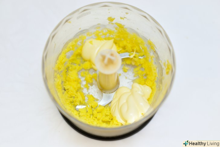 Помістіть м'якоть і майонез в комбайн.видавіть 3 столові ложки майонезу "Кьюпі" в блендер або невеликий комбайн. Туди ж додайте 1 столову ложку свіжовіджатої м'якоті імбиру.[19]- Через брак "Кьюпі" можна використовувати звичайний майонез. В такому випадку соус вийде без присмаку рисового оцту.