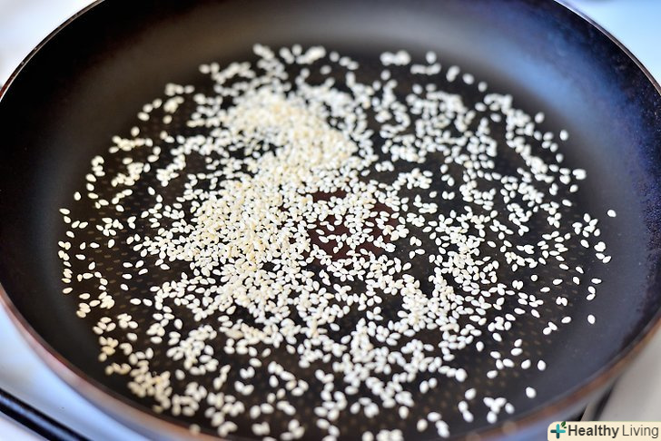 Підсмажте насіння кунжуту.розігрійте сковороду на середньому вогні. Насипте 2 ¼ чайних ложки (6 грам) насіння кунжуту і обсмажуйте протягом 3-4 хвилин. В процесі пассировки насіння трохи потемніють. Потім відкладіть їх в сторону.[9]- Ви відчуєте слабкий горіховий аромат, як тільки насіння будуть готові.