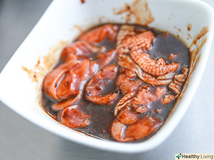 Наріжте і замаринуйте курку.гострим ножем наріжте курячу грудку на тонкі смужки. Збийте разом кунжутне масло, чорний оцет, рисове вино, Китайські гіацинтові боби / соус і 1-1/2 столові ложки (22.5 мл.) соєвого соусу. Перемішайте курку в суміші і залиште на 15 хвилин.- Охолодіть мариновану курку.