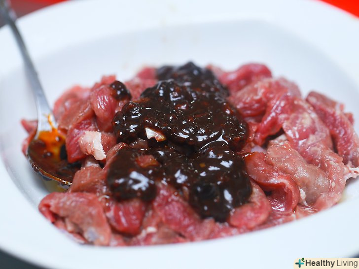 Замаринуйте яловичину.у великій мисці збийте разом кукурудзяний крохмаль, половину соєвого соусу і кунжутне масло. Додайте яловичину, потім добре розмішайте, поки все м'ясо не покриється.- Відставте м'ясо в сторону на 10-20 хвилин.