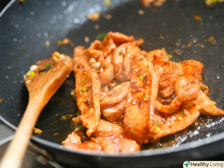 Смажте м'ясо та імбир.додайте скибочки смаженої свинини і шинки в масло. Покладіть подрібнений імбир в масло. Готуйте протягом декількох хвилин, часто помішуючи, поки м'ясо і імбир не стануть світло-коричневими з кожного боку.- Зверніть увагу, що аромат імбиру також повинен стати помітно сильніше.