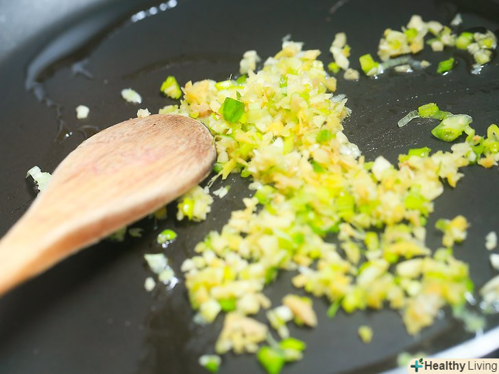 Смажте в розпеченому маслі ароматичні інгредієнти.покладіть імбир, часник і роздавлені частини зеленої цибулі в гаряче масло. Готуйте, постійно помішуючи, протягом 15 секунд або, поки витягується аромат.- Після приготування, обережно, притисніть ароматичні інгредієнти в одній стороні сковороди.