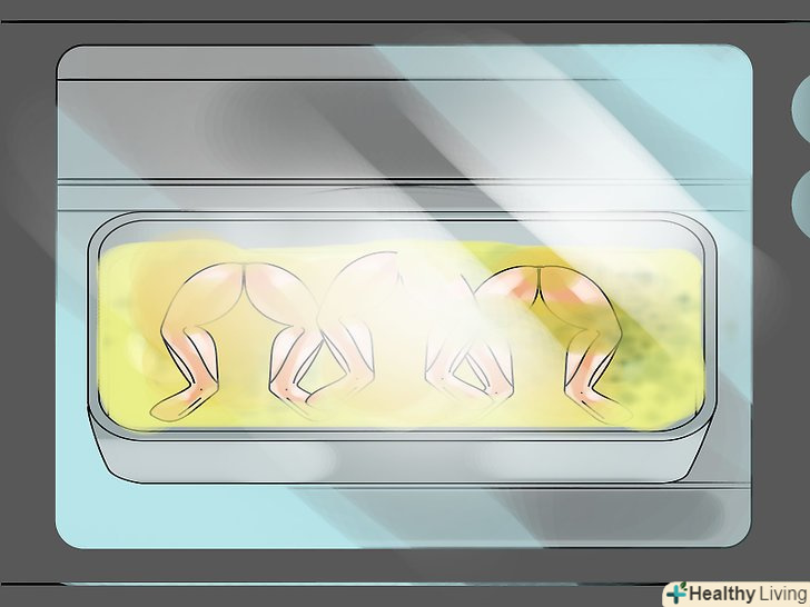 Запікайте до золотистого кольору.готуйте жаб'ячі лапки неприкритими в розігрітій духовці, приблизно 1 годину.- Ви не повинні перемішувати або струшувати жаб'ячі лапки, коли вони готуються, але якщо вам здається, що верхній шар потемнів задовго до кінця повного часу приготування, акуратно, за допомогою щипців, переверніть шматки на іншу сторону.