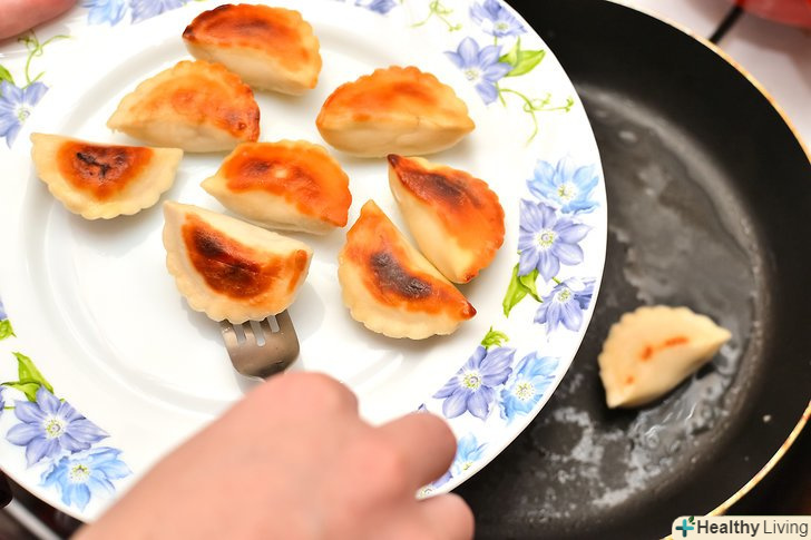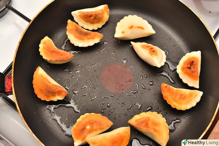 Готуйте цзяоцзи на пару, поки весь пар не випарується.ви почнете чути звуки потріскування, і цзяоцзи знову почнуть набувати золотисту скоринку. Традиційно, радять не перевертати цзяоцзи, а смажити їх до золотистої скоринки лише знизу.[4]- Якщо ви любите підсмажені, обережно підніміть їх лопаткою і переверніть, щоб підсмажити з іншого боку.