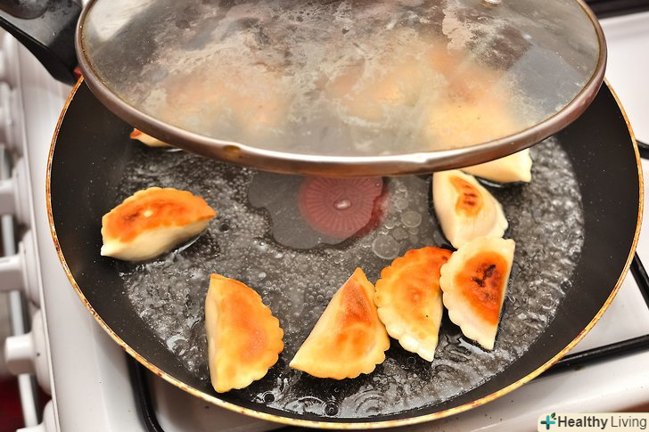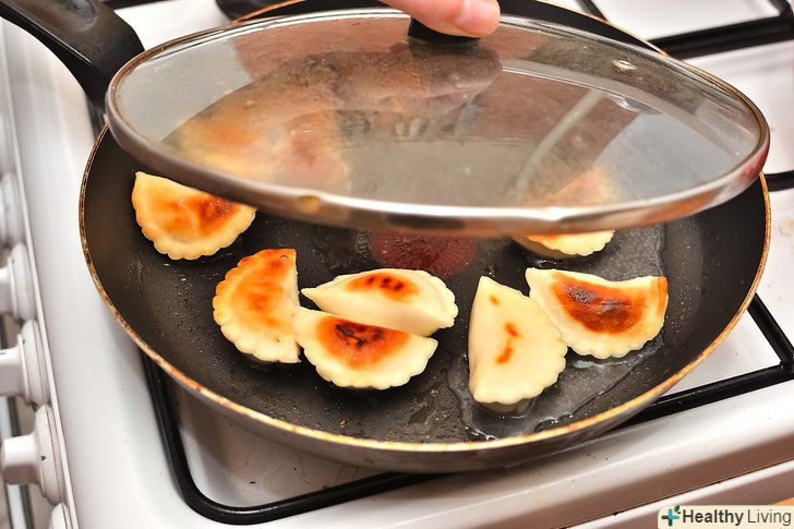 Додайте приблизно три столові ложки води в сковороду.негайно, після того, як Ви додали воду в сковороду, накрийте її щільною кришкою. Пар, що виходить від води, наскрізь приготує цзяоцзи. Дуже важливо накрити щільною кришкою, яка не пропускає повітря, тому що, якщо пара випарується, цзяоцзи будуть готуватися довше або перетравляться і стануть липкими. [3]