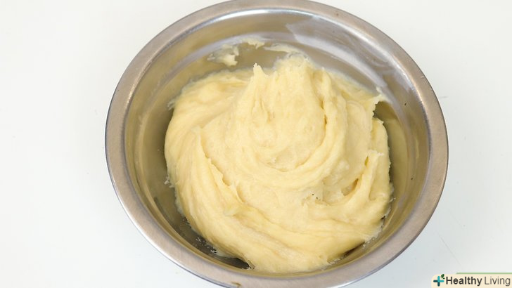 - Додайте суміш з яєць і ванілі в каструлю з гарячою сумішшю.добре перемішайте, щоб у вас вийшло тісто однорідної консистенції. У вас повинен вийти гладкий куля з тіста після того, як ви добре перемішати всі інгредієнти. Якщо ви потягнете тісто вгору, воно повинно прийняти форму гачка. Якщо у вас не виходить досягти необхідної консистенції тесту, додайте ще одне збите яйце.[2]