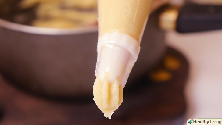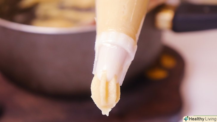 - Зробіть кондитерський мішок своїми руками. Візьміть невеликий пакет і викладіть в нього тісто. Потім відріжте нижній кут пакета. У вас повинно вийти невеликий отвір. Натискаючи на пакет, видавіть тісто так, щоб у вас вийшов чуррос.[4]