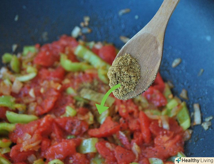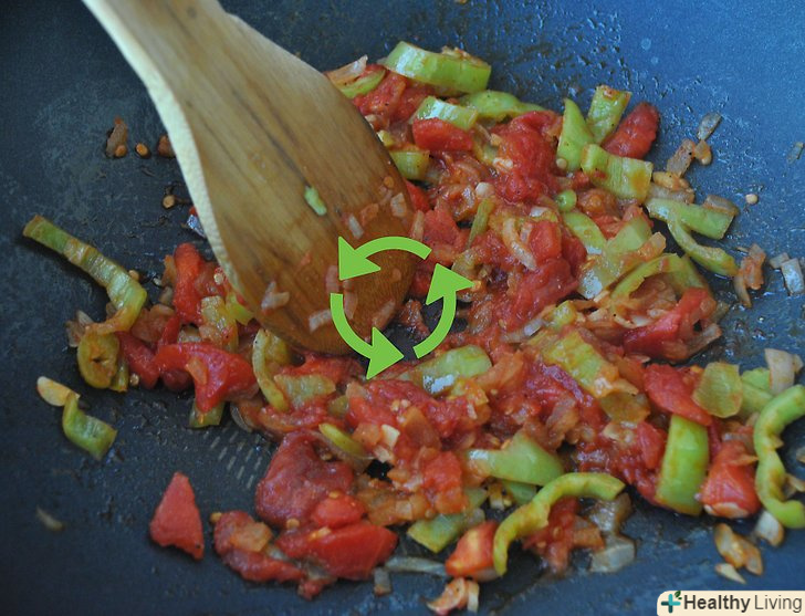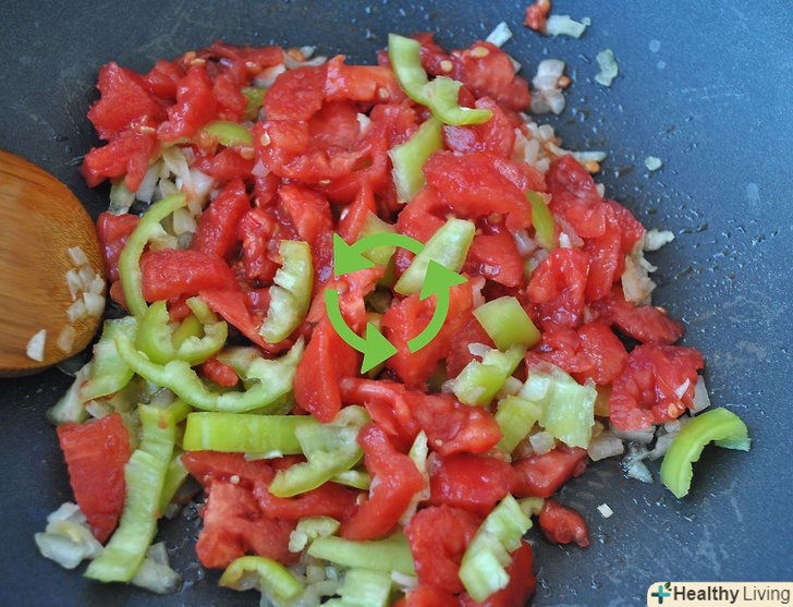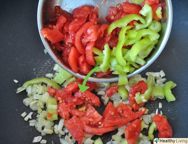 Коли цибуля підрум'яниться, додайте до нього нарізані помідори і перець.якщо хочете, щоб шакшука вийшла гострою, додайте одну ст.ложку вашого улюбленого гострого соусу або меленого перцю чилі. Сюди можна додати також сосиски або інші інгредієнти, щоб шакшука вийшла більш креативною і цікавою (див.розділ поради).