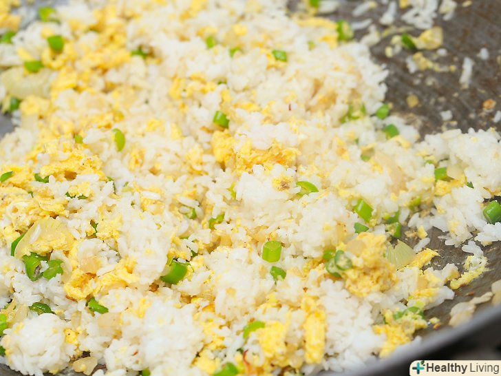 Всипте до яєчної суміші рис.перемішайте яйце і рис з овочами в воке. Обсмажуйте протягом 2 хвилин, або до тих пір, поки рис не стане коричневим.