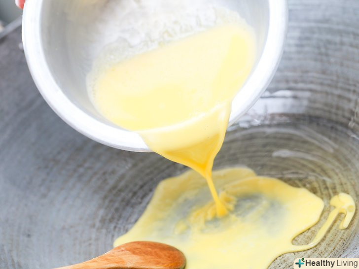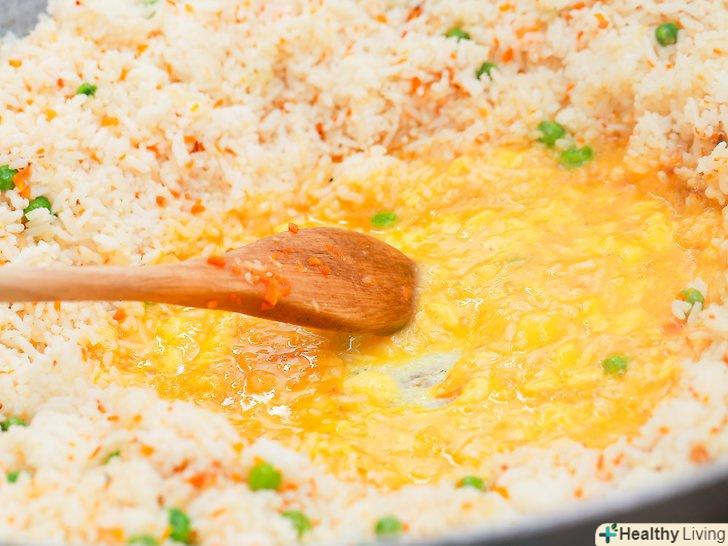 Збийте яйце.лопаткою відсуньте злегка обсмажену суміш в сторону. Вилийте яйце на місце, що звільнилося і збийте лопаткою. Коли яйце підсмажиться, змішайте його з рисом і овочами.[6]- Альтернативний спосіб підсмажити яйце-відсунути під нахилом рис і овочі в сторону і вилити яйце в вок. Обсмажуйте яйце 10 секунд, потім розмішайте його паличкою, перш ніж почнете змішувати з сумішшю лопаткою. Продовжуйте смажити ще хвилину.[7]