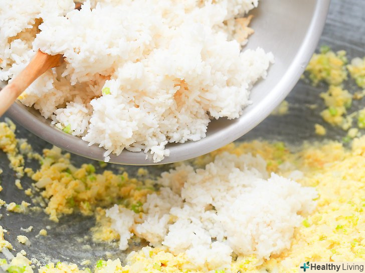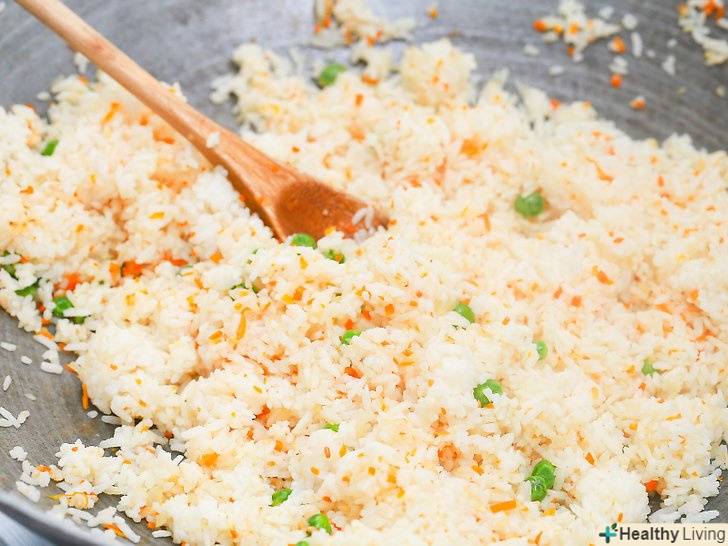 Додайте рис.всипте рис до овочів і обсмажте. Обсмажуйте суміш з рису і овочів протягом 3-4 хвилин.[5]