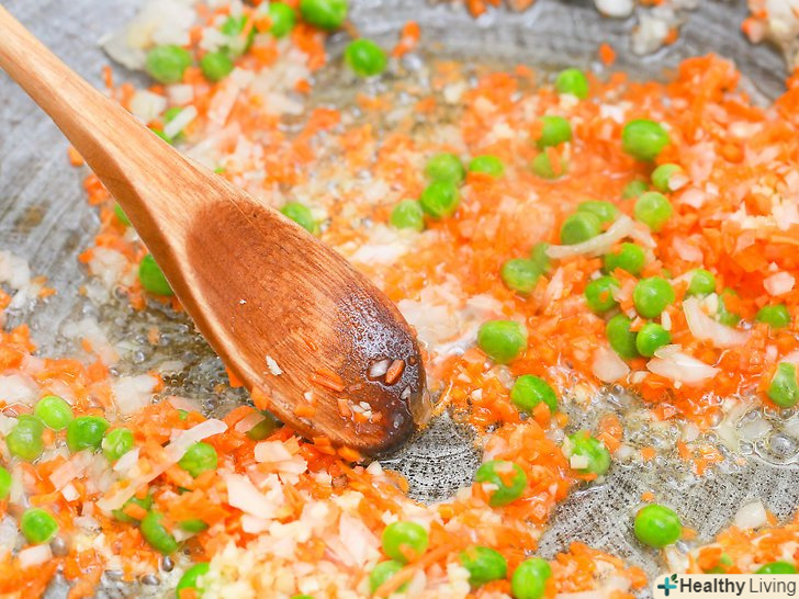 Підсмажте овочі.розігрівайте масло в воке, поки воно не почне диміти. Додайте горох, моркву і цибулю. Смажте, помішуючи, поки овочі не потемніють і не размягчатся.[3]- Обсмажування-це спосіб приготування їжі, коли невеликі шматочки швидко готуються в невеликій кількості розпеченого масла в воке або великій сковороді на середньому вогні. Обсмажені овочі зберігають свій колір, хрускіт і поживні речовини. Готуйте, поки овочі не стануть хрустко-ніжними.[4]