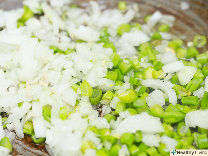 Пасеруйте овочі.розігрійте вок на сильному вогні і додайте трохи олії. Додайте в вок зелену квасолю з цибулею і посмажте ще 2-3 хвилини, поки вони не стануть злегка хрусткими і коричневими.[11]