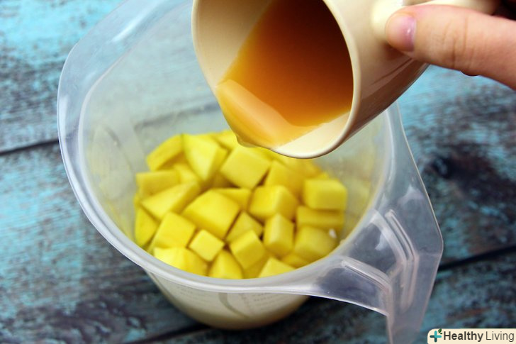 Покладіть в блендер 2 склянки заморожених шматочків манго.зверху влийте 1 склянку свіжовичавленого апельсинового соку.[9]- Міцно закрийте кришку блендера.