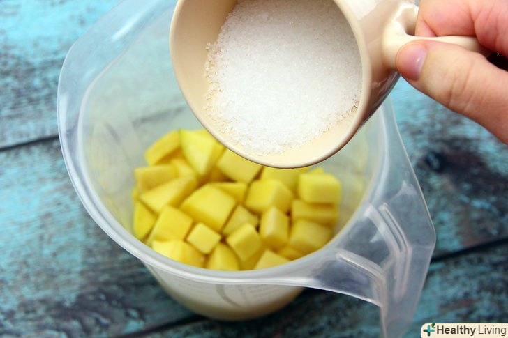 Покладіть в комбайн або блендер 900 грамів нарізаного манго.всипте 1 склянку цукру і ½ чайної ложки солі.[12]- Щільно закрийте кришку міксера або комбайна.