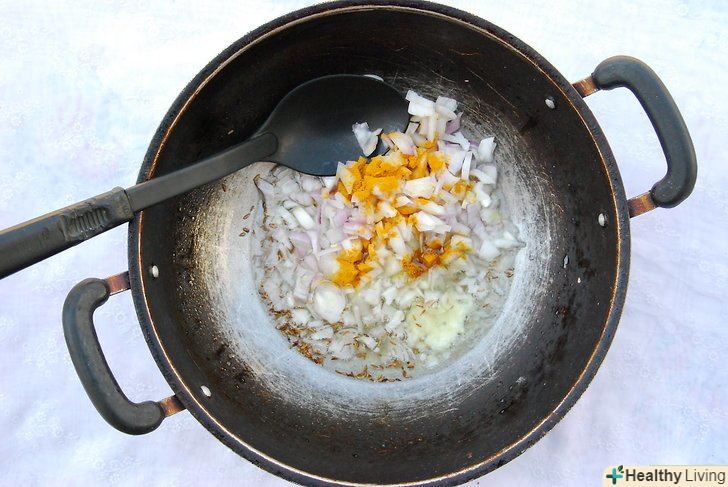 Як тільки кмин почне блищати, додайте куркуму, імбир часникову пасту і цибулю.
