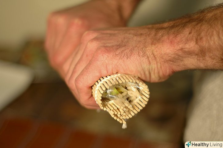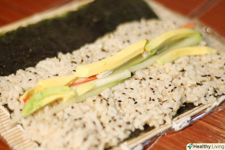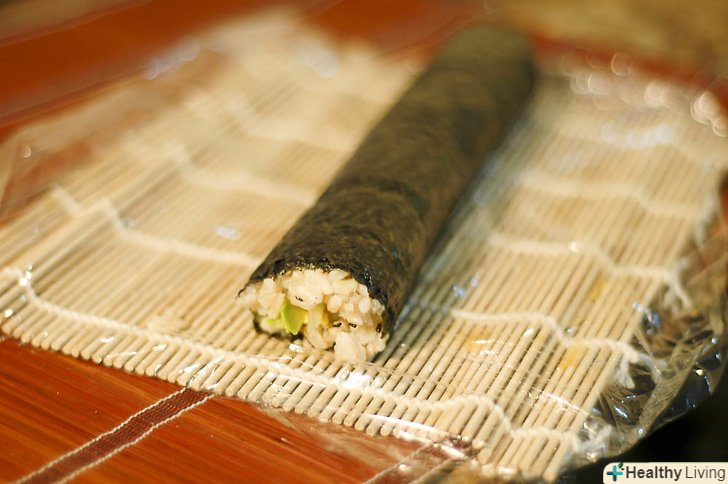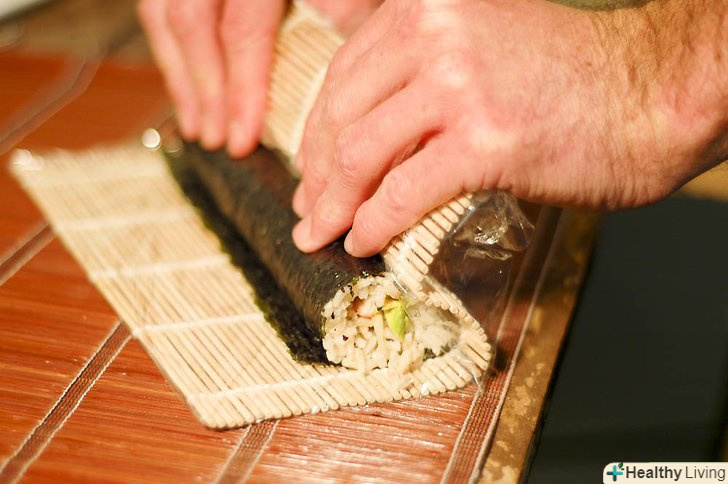 Притримуйте килимок великими пальцями.почніть формувати рулет з краю, на якому знаходяться начинки. Підніміть лист норі і загорніть в нього перший ряд інгредієнтів. Переконайтеся, що начинка на місці.- Продовжуйте формувати рулет.Крутите повільно, щоб рол вийшов рівним. Сховайте вільний край норі в вийшов рол.