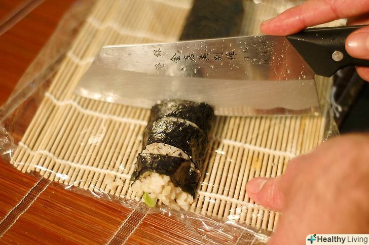Розріжте рол на 6 або 8 частин, використовуючи гострий і змочений водою ніж.товщина суші залежить від кількості інгредієнтів: чим їх більше, тим тонше повинні бути суші.